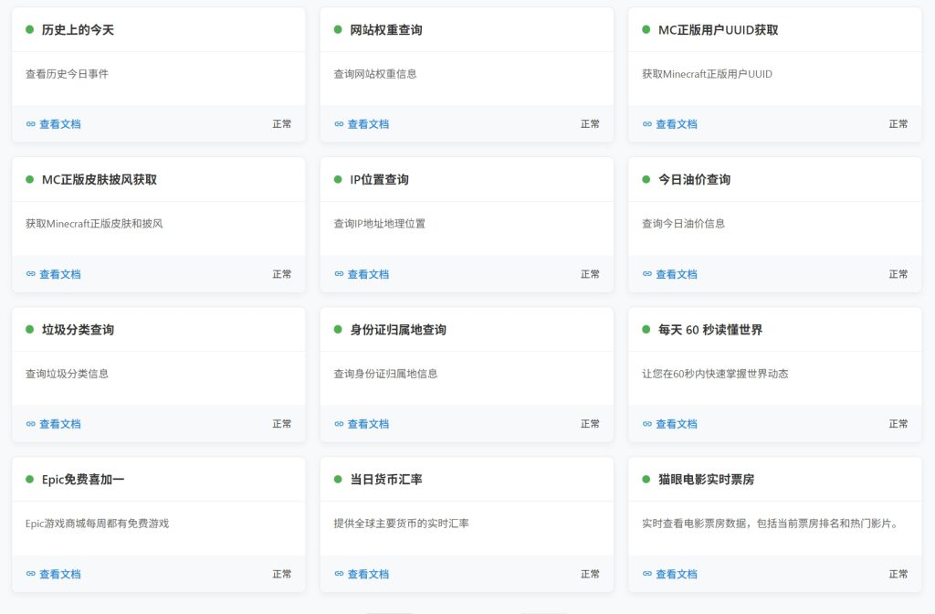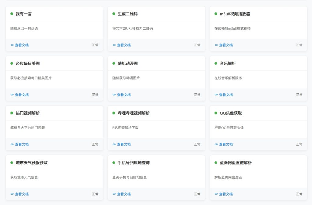 目前该网站正常运行api有24个,包含“一言API” “生成二维码API” “m3u8视频播放器API” “必应每日美图API”“随机动漫图API” "音乐解析API" "热门视频解析API" "哔哩哔哩视频解析API" "QQ头像获取API" "城市天气预报获取API" "手机号归属地查询API" "蓝奏网盘直链解析API" "历史上的今天API" "网站权重查询API" "MC正版用户UUID获取" "MC正版皮肤披风获取API" "IP位置查询API" "今日油价查询API" "垃圾分类查询API" "身份证归属地查询API" "每天 60 秒读懂世界API" "Epic免费喜加一API" "当日货币汇率API" "猫眼电影实时票房API"